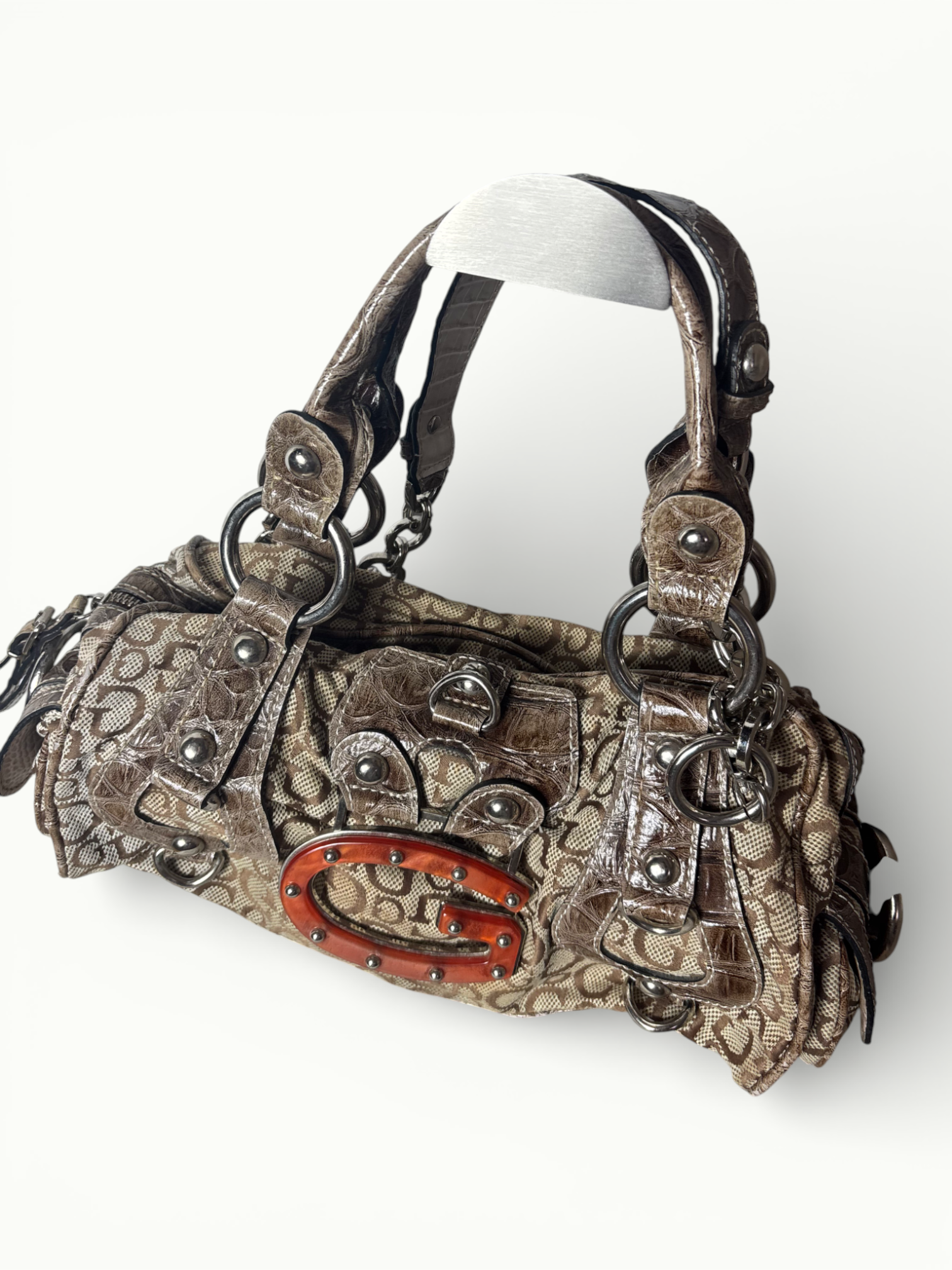 Authentic vintage Guess shoulder bag featuring the iconic all-over monogram in beige and brown tones, finished with a bold statement “G” logo with studded details and a tortoiseshell effect.