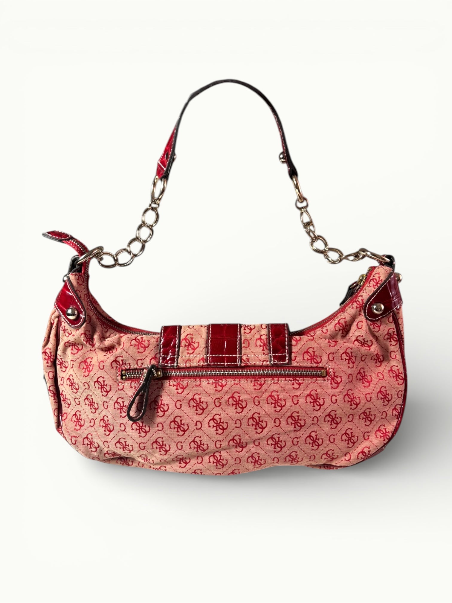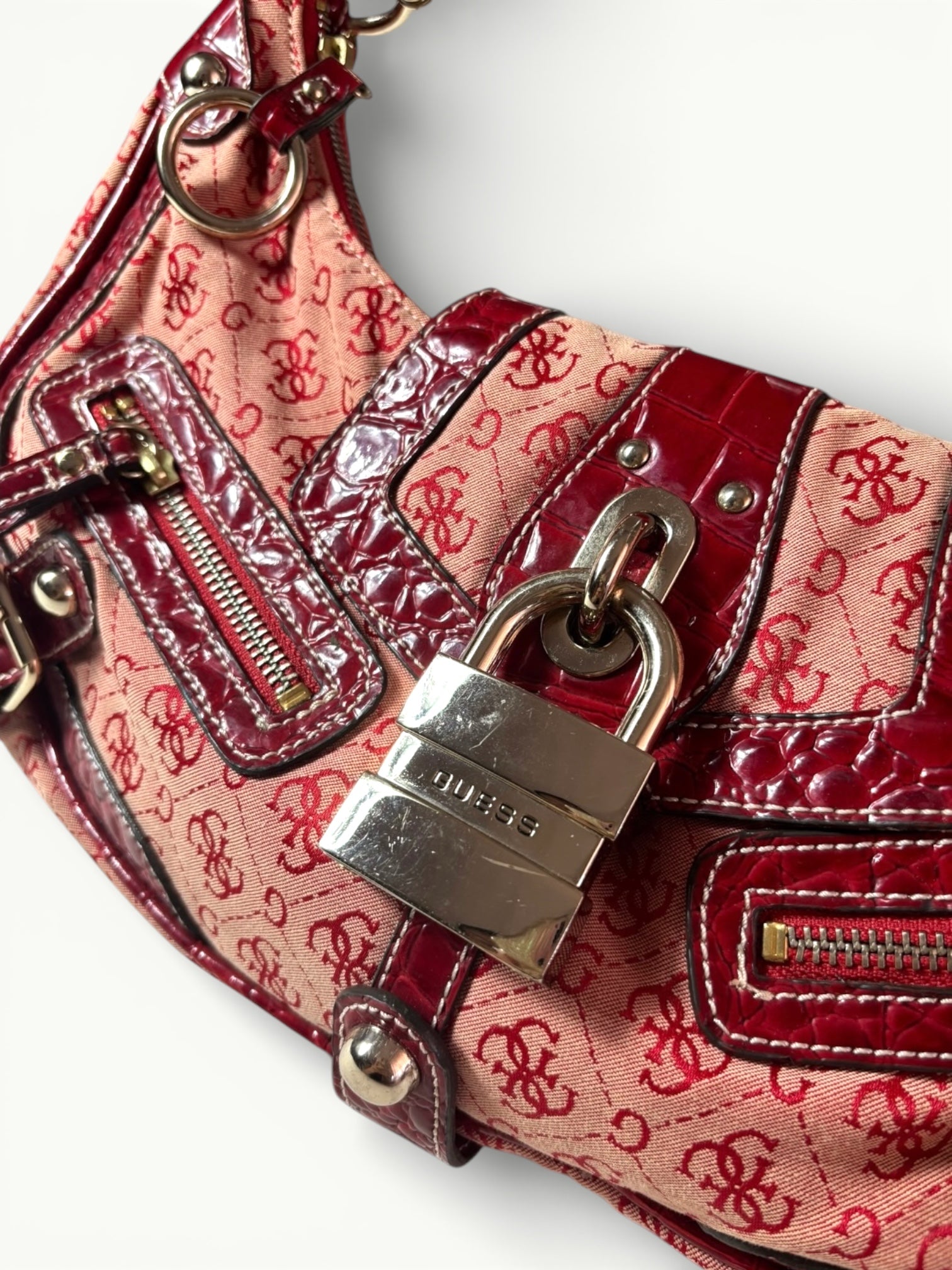 Make a bold statement with this vintage Guess shoulder bag featuring the iconic red monogram canvas and glossy patent leather details. Designed with a signature padlock closure and eye-catching hardware, this piece captures true Y2K glamour with a playful yet edgy vibe.